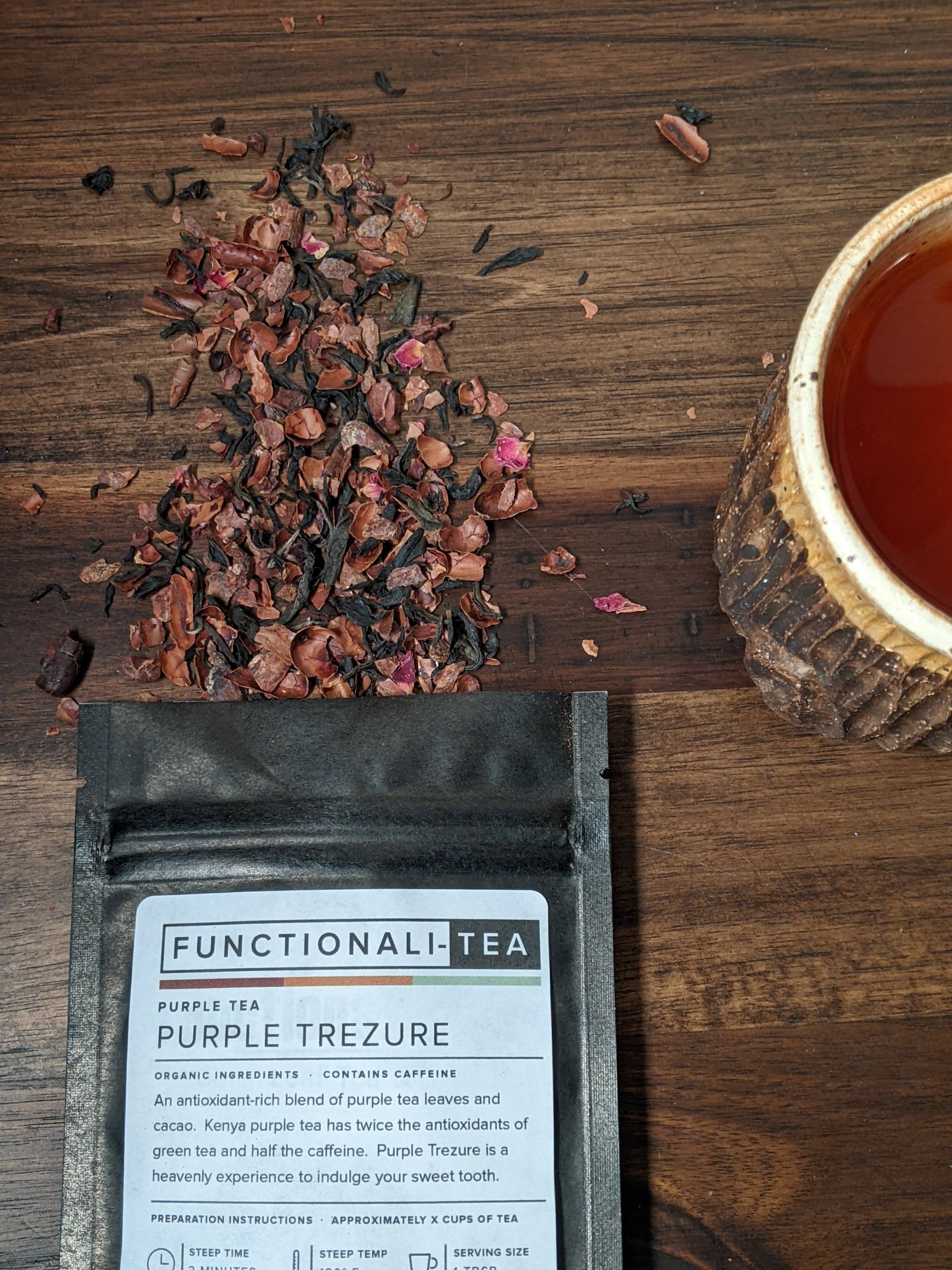Introducing our newest tea blend, Purple Trezure. This antioxidant-rich tea contains purple tea leaves, cacao, and red and pink rose petals.
